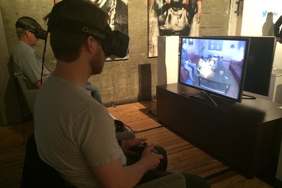 Two people playing a demonstration game for the new Oculus development kit, shipping in July, 2014. Ian Sherr for The Wall Street Journal